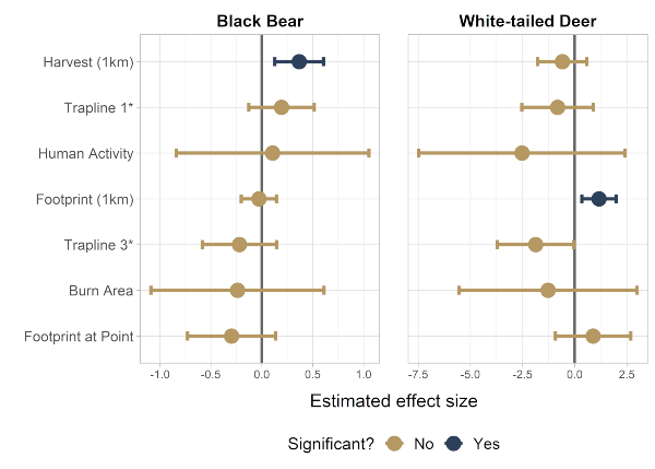 - a 10% increase in the proportion of harvest area disturbance within 1 km of a camera site increases Black Bear density by 0.34 individuals per km2.